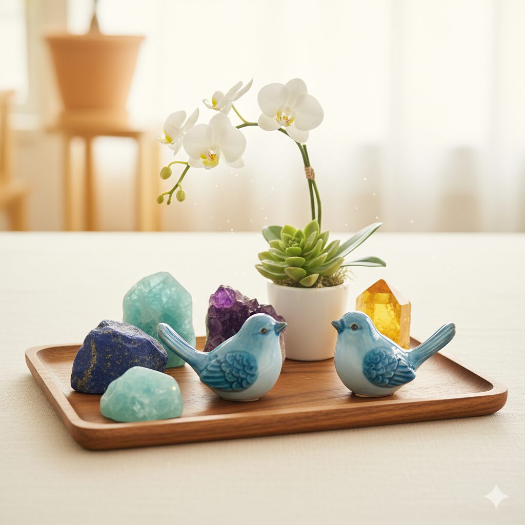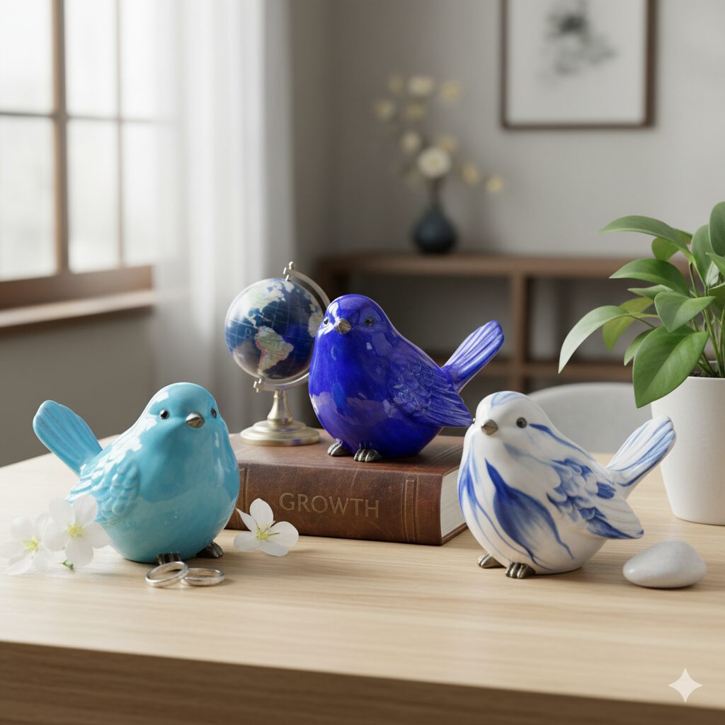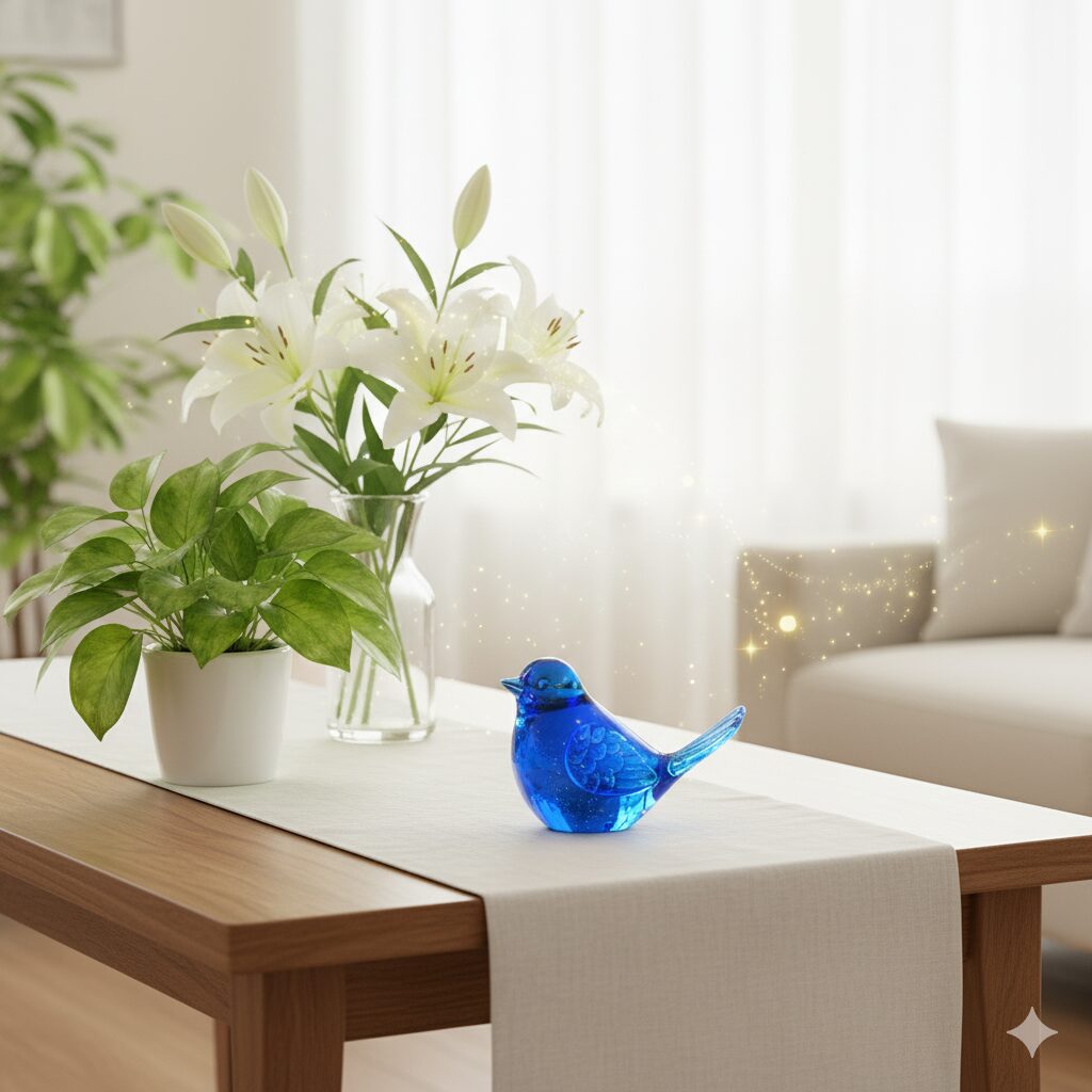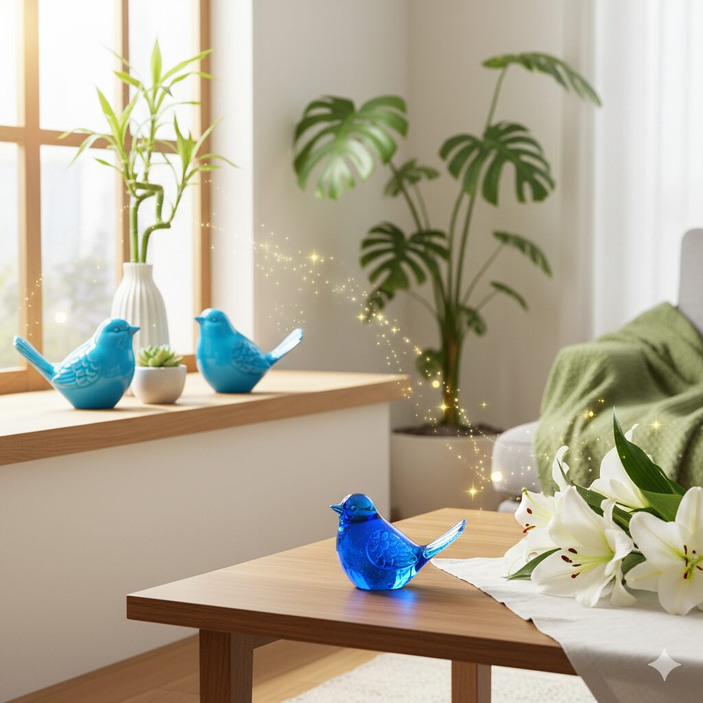 「コミュニケーション運を特に高めたいなら、複数羽の青い鳥の置物を、互いに向き合うように配置すると効果的ですよ。調和と信頼の気が高まり、家庭内や職場での人間関係がスムーズになります。」