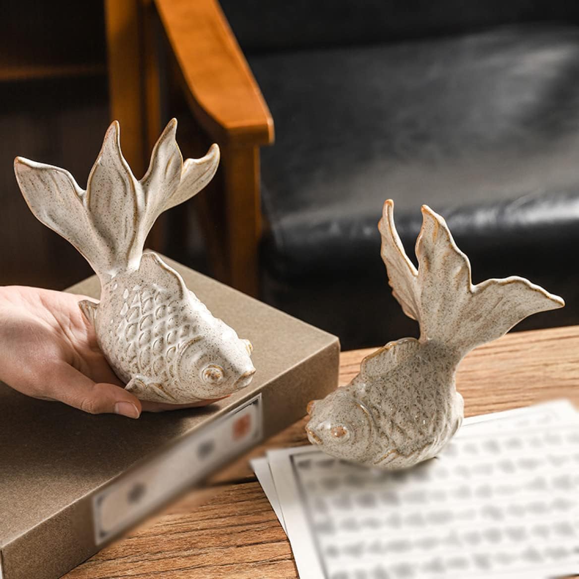 この手作りの陶器製金魚は、ユニークな漫画スタイルが特徴の置物です。熟練の職人によって細部まで丁寧に彫刻されており、生き生きとした表情と動きが楽しめます。