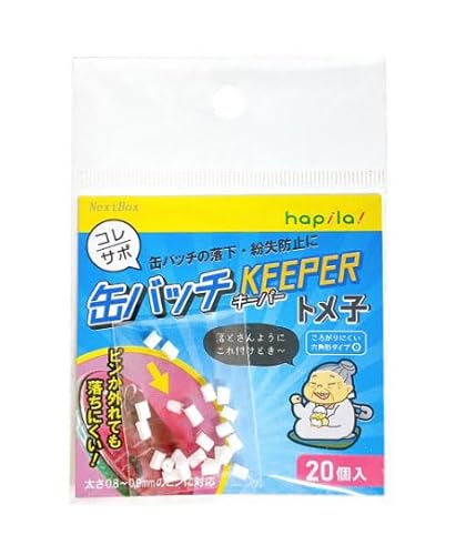 推奨されるのは「缶バッチKEEPER トメ子(JAN:4550163002398)」です。これはシリコン製のストッパーで、通常の留め具の前に差し込むことで、針の露出を防ぎつつ、摩擦によって脱落を強力に防止する優れものです。