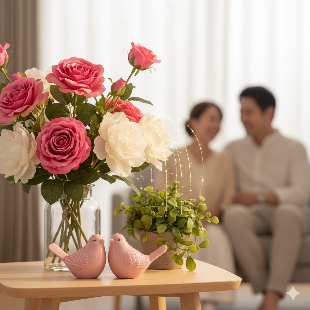 小鳥の置物が持つ「陽」のエネルギーをさらに高め、風水効果を増幅させるのが、花の置物や生花との組み合わせです。